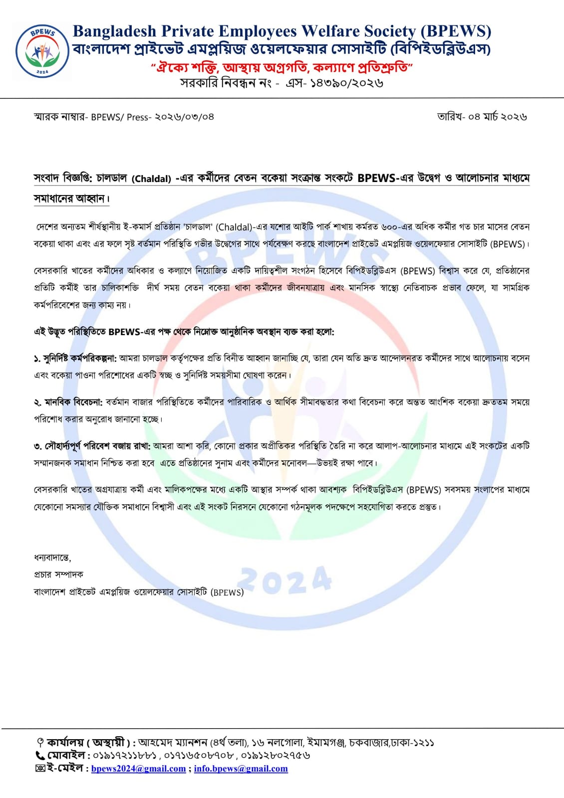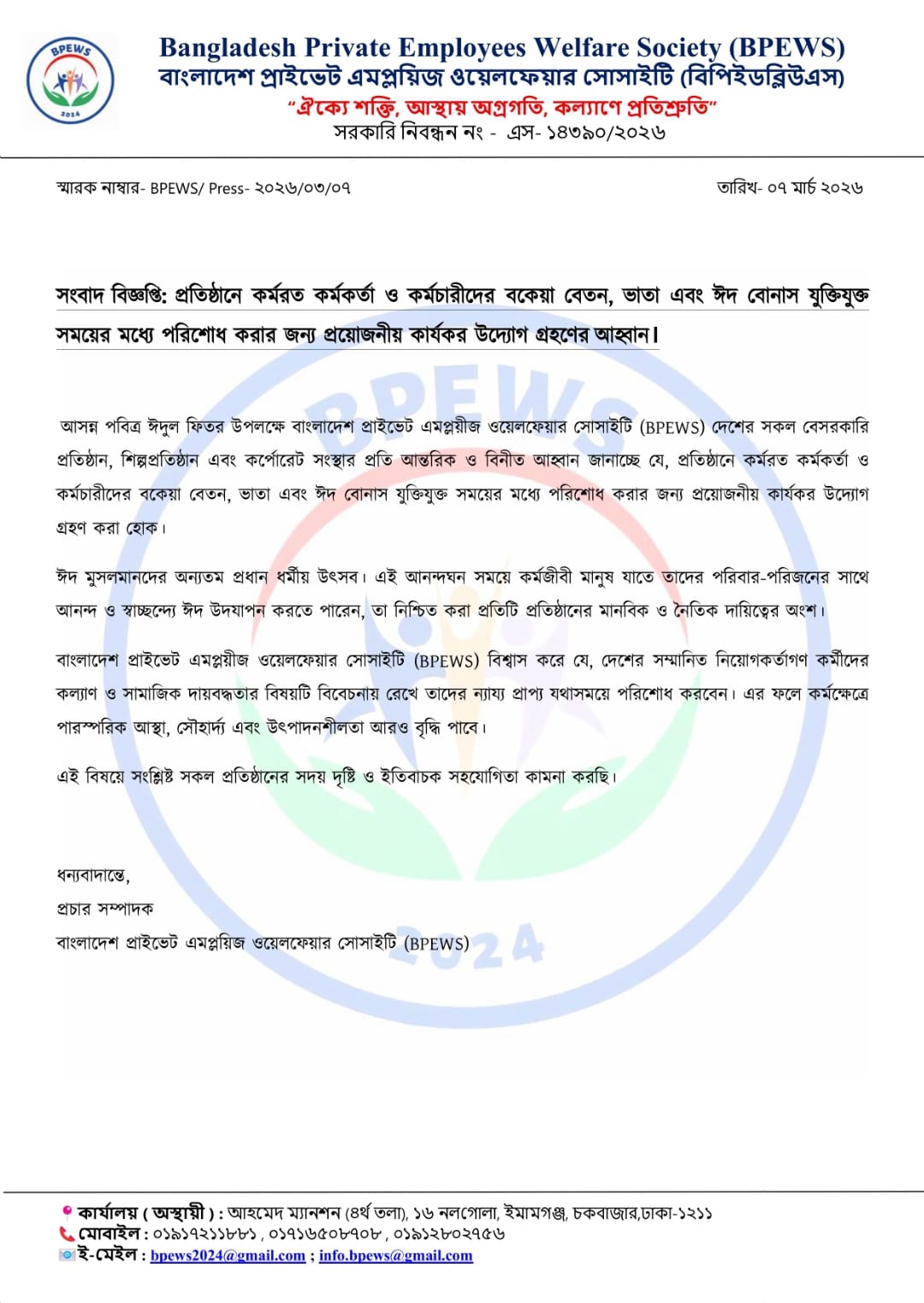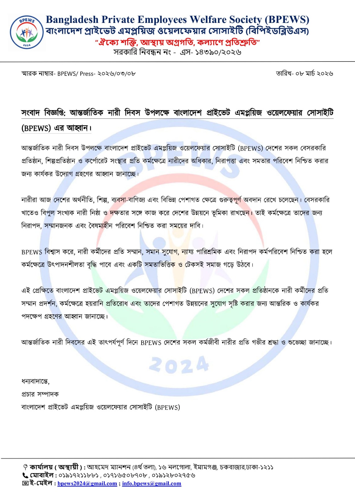 Bangladesh Private Employees Welfare Society (BPEWS) is a non-political, progressive organization dedicated to the rights, dignity, and professional excellence of private sector employees nationwide.